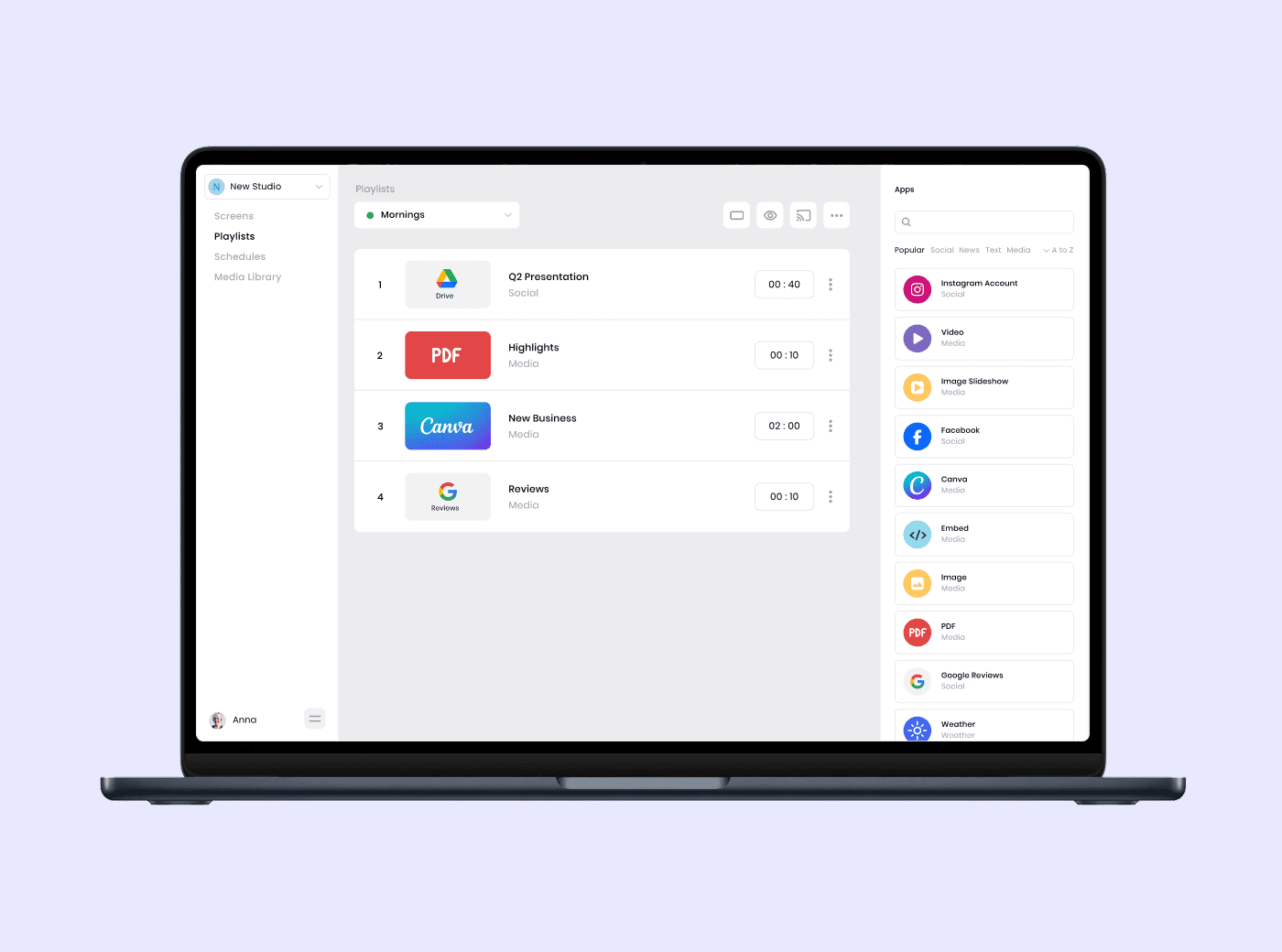 Create playlists that combine multiple Google Slides presentations with videos, PDFs, or images. Keep your content fresh and structured without logging in daily.